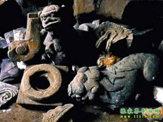 土司古墓群多集中于司城紫金山、雅草坪、帕桶湖三個地方,其中以紫金山最多。據(jù)勘察,紫金山一處共有土司王及其貴族墳?zāi)?09座。彭福石沖以后的土司、土官及其眷屬,都分別埋葬在這里。古墓的規(guī)模大小,視其官爵而定。從已挖開的30多座古墓來看,基本形式是用土磚拱成半圓形,墓前有石人石馬,四周筑有圍墻,進(jìn)出必經(jīng)鐵門。墓室四壁上刻有精美的花草圖案和龍鳳圖案。棺材系楠木、梓木做成,用土漆漆成烏黑色,并用鐵鉤懸掛在石室之內(nèi)。隨葬器物也極為豐富,有金花、金譬、發(fā)插、耳環(huán)、蓮蓬等金銀飾物,還有各種玉器等。明代一些名土司彭顯英、彭冀南等人的墳?zāi)怪两裆斜4嫱旰?。古墓群現(xiàn)為湖南省重點文物保護(hù)單位。