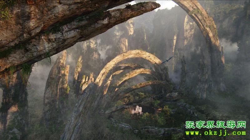 巍巍群山漂浮在天空,云霧繚繞,美麗壯觀……這是電影《阿凡達(dá)》中的經(jīng)典場(chǎng)景。阿凡達(dá)的全球熱映使人們對(duì)這部電影充滿了驚嘆和好奇,而這部影片奇幻的拍攝地到底是在哪里這一問題也引發(fā)了影片熱愛者的紛紛推測(cè)。導(dǎo)演卡梅隆的一句“中國(guó)元素給《阿凡達(dá)》大大增色”不僅勾起了旅游愛好者的向往之心,更是引發(fā)了一場(chǎng)不小的爭(zhēng)論。片中美輪美奐的“哈利路亞山”讓人驚嘆向往,現(xiàn)實(shí)版的“哈利路亞山”到底是以黃山還是張家界的武陵源為背景,成了網(wǎng)友和旅游界的熱議焦點(diǎn)。“第42秒出現(xiàn)過(guò)張家界的南天一柱,第33分21秒出現(xiàn)過(guò)黃石寨的玉屏峰,第55分53秒出現(xiàn)過(guò)寶峰湖的瀑布……”在網(wǎng)上,有發(fā)帖者將這些在《阿凡達(dá)》影片中出現(xiàn)過(guò)的張家界景致一一羅列。通過(guò)慢放發(fā)現(xiàn),影片中大概有25分鐘完全是張家界的山水風(fēng)光。出現(xiàn)多次的是黃石寨前山的南天一柱,金鞭溪的劈山救母出現(xiàn)不低于5次,然而出現(xiàn)最多的還是寶峰湖瀑布和袁家界迷魂臺(tái)里面的擎天柱。而張家界和黃山的最大區(qū)別是黃山是花崗巖地貌,上面非常光滑,幾乎沒有植被,而張家界是石英砂巖地貌,上面植被覆蓋非常茂盛。