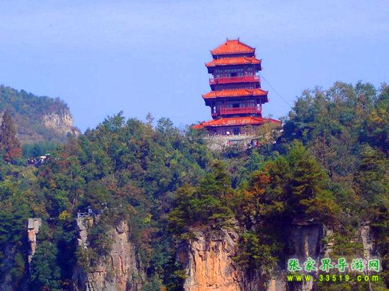這是六層四重檐穿頭式仿古建筑,高30米,由深圳市政府捐建。建立之初,本打算取名叫“深圳閣”,但遭到許多人(包括深圳人)反對,認為這樣與整個天子山的風(fēng)景不是很協(xié)調(diào)。不過從另一個角度來看,深圳人這種“經(jīng)營城市”的意識,卻非常值得張家界人學(xué)習(xí)。“欲窮千里目,更上一層樓”,登樓遠望,天子山群峰盡收眼底,別有一番風(fēng)景。