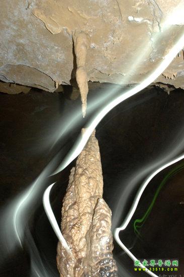 在這兒向您介紹一點(diǎn)溶洞學(xué)的知識(shí)。在溶洞中,自洞頂往下生長(zhǎng)的叫石鐘乳,自洞底往上生長(zhǎng)的叫石筍,兩者相向生長(zhǎng)連在一起就叫石柱,三者統(tǒng)稱(chēng)為鐘乳石。這兒有一根石鐘乳與一根石筍是相對(duì)生長(zhǎng)的,差一點(diǎn)點(diǎn)就要連起來(lái)了,但他們卻永遠(yuǎn)不能合在一起,因?yàn)樯厦娴氖娙橐呀?jīng)沒(méi)有滴水,已經(jīng)失去了生命力。這好像一對(duì)苦苦守望的情人,近在咫尺,卻永遠(yuǎn)不能相逢。于是人們便給他們?nèi)×艘粋€(gè)非常動(dòng)人的名字——恨難逢。“盈盈一水間,脈脈不得語(yǔ)。”“天涯海角有窮時(shí),只有相思無(wú)盡處。”在無(wú)數(shù)個(gè)春去秋來(lái)的日子里,他們?cè)撚卸嗌匐x愁別緒??!——真不知道是石頭多情,還是人多情?——而有的人說(shuō)得很樂(lè)觀(guān),“兩情若是長(zhǎng)久時(shí),又豈在朝朝暮暮”,所謂“距離產(chǎn)生美”嘛。