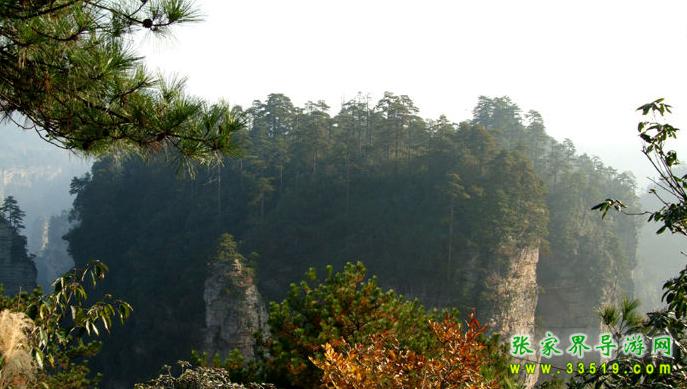 立黃石寨頂東北沿隔澗而望,對(duì)面一巖體臺(tái)地,高200余米,頂部面積約數(shù)百畝,四圍陡峭如削。其上長(zhǎng)滿黑黝黝的樹(shù)木,借助望遠(yuǎn)鏡,可看清有武陵松等,蒼翠蓊郁,猶如綠色迷宮。