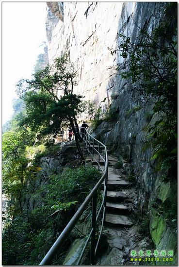 由群仙開宴景點沿石徑蜿蜒而下約200米處,一巨峰于半腰分裂,內(nèi)可行人,長300米,寬0.1-1米。南側(cè)懸崖峭壁,深不見底。北側(cè)石壁高50米,抬頭不見其頂。人行其內(nèi),如置身空中長廊。廊中虬松懸崖,亂云飛渡,山風呼嘯。廊之東、南和西南三面峰立如林,或如城墻,或加堡壘,各呈奇舉。
