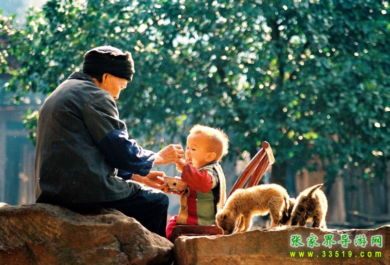 孩子們自從娘胎里出來,父母們就給備好了一首首童謠。在襁褓中時,有簡短的搖籃曲。“我的小寶貝,睡吧快快睡,你莫哭,快長大,我的小寶貝”,伴以“喲嗯”之類的喉音和鼻音??摁[的孩子在這低低的吟哦中,在這輕柔的春風(fēng)中,會緩緩的走入夢鄉(xiāng)。到孩子牙牙學(xué)語時,就會換上新的內(nèi)容。為讓孩子從小懂得廉恥,大人會教孩子《蟲蟲兒飛》:“打板板,逗蟲蟲兒,蟲蟲兒飛,飛到嘎兒(外公)去。嘎兒不趕狗,咬到蟲蟲兒的手;嘎兒不殺雞,蟲蟲兒不回去;嘎兒不打蛋,蟲蟲兒不吃飯;嘎兒不殺鵝,蟲蟲兒不過河。”(土家把孩子名字叫得賤,喊成“蟲蟲兒”)。在唱的同時手把手地教孩子做蟲蟲飛的動作。唱完后,又會用手指點點孩子的左右臉,刮一下孩子的鼻子,“這兒也丑,那兒也丑,鼻子刮豬油。”意思是好吃是丟臉的,蟲蟲兒可不能這樣。勤勞是做人的根本,也是土家人的傳統(tǒng)美德,“三歲看大,八歲看老”,大人會教些勤勞的童謠。《賣豆腐》道:“一顆豆子圓又圓,推成豆腐賣成錢,別人講我生意小,小小生意賺大錢。”為讓孩子自小懂得親疏,教孩子《推磨》:“推磨拐磨,推的粑粑白不過。推粑粑,接嘎嘎,嘎嘎不吃娃娃的酸粑粑;推豆腐,接舅舅,舅舅不吃娃娃的酸豆腐;推合渣,接姨媽,姨媽不吃娃娃的酸合渣……”夏日的夜晚,一家人出來在月亮地里歇涼,有夜火蟲(螢火蟲)舉著火把飛來,母親會以夜火蟲打頭,以“一問一答”的聯(lián)句方式,考考孩子的記憶力:“夜火蟲,夜夜來,嘎婆接你吃茶來。什么茶?豆茶。什么豆?黃豆。什么黃?朱砂黃……”