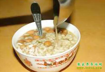 油茶湯對(duì)土家族人來(lái)說一日三餐少不了。土家油茶湯是張家界土家族具有代表性的包含文化現(xiàn)象之一,土家語(yǔ)稱“色斯?jié)缮?rdquo;,堪稱中國(guó)茶文化一絕,源遠(yuǎn)流長(zhǎng)。據(jù)清代的古書記載:“土人以油炸黃豆,包谷,米花,綠焦諸物,取水和油,煮茶葉和湯泡之,餉客致敬,名曰:‘油茶’”。