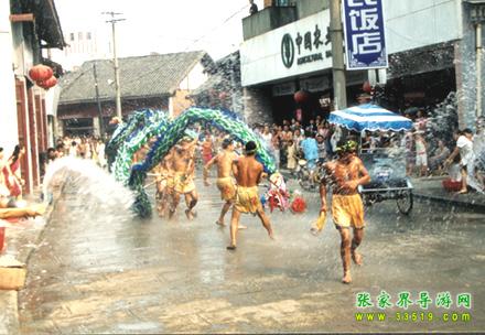 張家界潑水龍又叫“澆水龍”,于唐朝時(shí)期由移居本地的白族興起演變而成,在永定區(qū)的尹家溪鎮(zhèn)西尹村、莫家崗村十分盛行,是當(dāng)?shù)?a class="insidelink" href="http://www.qkgfd.com/fengqing/" title="土家族">土家族,白族、苗族在天熱干旱時(shí)節(jié)求雨祈福的一種形式。一旦出現(xiàn)旱災(zāi),當(dāng)?shù)仡^面人物就會(huì)出來組織潑水龍,演出極其隆重。