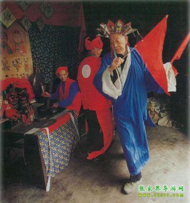儺戲在湘西土家族地區(qū)也稱儺堂戲、儺神戲,它與土家族原始巫教、巫術(shù)的關(guān)系極為密切。土家族先民信奉的神有儺神、八部大神、土地神等,作為一種宗教活動(dòng),這種原始信仰與社會(huì)生產(chǎn)活動(dòng)、文娛活動(dòng)及民族習(xí)俗是融為一體的,因此儺戲最先的“沖儺還原”帶有明顯迷信色彩,土家族群眾中有“一儺沖百鬼,一愿了千神”的說(shuō)法,湘西土家族人干脆叫它為“神戲”。湘西土家族儺戲的發(fā)展過(guò)程大體是儺、儺舞、儺儀然后才產(chǎn)生儺戲。儺舞源于久遠(yuǎn)的蒙昧?xí)r期,土家先民們?cè)谕笞匀蛔鞫窢?zhēng)、同毒蟲(chóng)猛獸作斗爭(zhēng),便產(chǎn)生了化裝護(hù)面、在鼓樂(lè)聲中奔騰呼號(hào)、沖殺跳躍的原始儺舞,其所模擬的鳥(niǎo)雀舞、猿猴舞、熊舞等頗為壯觀。儺舞與儺這種驅(qū)鬼消災(zāi)的祭祀儀式結(jié)合后,增加了祈求人獸平安、五谷豐登、緬懷祖先、勸人去惡從善、以及傳播生產(chǎn)知識(shí)等內(nèi)容,這就逐漸形成了兼?zhèn)潢U弘教義及娛樂(lè)性質(zhì)的祭祀風(fēng)俗歌舞。[2]土家族儺戲就是在此基礎(chǔ)上發(fā)展起來(lái)的。部分土家族學(xué)者認(rèn)為土家族儺戲的遠(yuǎn)源可以追溯到戰(zhàn)國(guó)時(shí)代的《九歌》,《九歌》是土家族儺戲的雛形,他們的依據(jù)是當(dāng)時(shí)楚國(guó)的沅湘流域,人們“信巫鬼、重淫祀”(《漢書(shū)·地理志》),從而使得“陰陽(yáng)人鬼之間,又或不能無(wú)褻慢淫荒之雜”(宋代朱熹《楚辭集注》)。屈原正是加工整理了這一類“鄙陋”之詞,才創(chuàng)作出《九歌》、《天問(wèn)》等名篇。也有部分學(xué)者不贊同這種論點(diǎn),他們認(rèn)為土家族儺在宋代還停留在儺祭和儺舞階段,最遲到明代,土家族儺才發(fā)展成為儺戲[3]。嘉靖《常德府志》記載:“歲除,歲將盡數(shù)日,鄉(xiāng)村多用巫師,朱裳鬼面,鑼鼓喧舞竟夜,名曰還儺。”文中未點(diǎn)明“儺戲”二字,但卻使用了“還儺”一詞,這與今天民間對(duì)儺戲的稱呼相似。又據(jù)清乾隆《永順縣志》載:“永俗酬神,必延辰郡巫師唱演儺戲,……至晚,演儺戲。敲鑼擊鼓,人各紙面一,有女裝者,曰孟姜女;男扮者,曰范七郎。”在土家族儺戲中,孟姜女傳說(shuō)故事占著非常重要的地位。在湘西土家族地區(qū),儺戲一般有二十四正戲,即二十四戲神。每次儺儀結(jié)束時(shí),巫師要用香火在黃裱紙上燒二十四個(gè)洞,以表示奠祭二十四戲神。民間有諺語(yǔ):“儺神菩薩不識(shí)字,只要二十四個(gè)圈圈滿。”在二十四儺神中,被稱為勾愿神的姜女、范郎是還儺愿時(shí)非常重要的兩位神靈。在儺戲中,《孟姜女》是整場(chǎng)的高潮,平時(shí),儺戲唱完后,由沒(méi)下裝的孟姜女、范郎去向主人家及觀眾“拜臺(tái)”,以示“了愿”。清代中期以后,儺戲吸取了花燈、陽(yáng)戲、高腔等其他地方戲劇劇種的唱腔和劇目,逐漸變得日益成熟。我們仔細(xì)查看了全國(guó)371個(gè)劇種,發(fā)現(xiàn)儺戲、花燈戲有著相同的班社,也就是說(shuō)一個(gè)演出班社可以演出儺戲、花燈戲兩個(gè)劇種。這段時(shí)期,儺戲已作為獨(dú)立戲劇劇種參加演出。由于儺戲是由巫儺法事演變而成的戲劇形式,經(jīng)歷著巫儺法事(驅(qū)鬼祭祀)、儺壇上戲和儺堂正戲的發(fā)展過(guò)程。