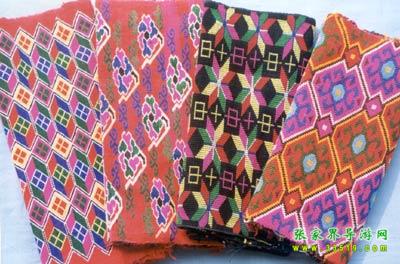 織錦。又名西蘭卡普、土花鋪蓋,為土家族傳統(tǒng)工藝品之一,是森林公園工藝品廠的主要產(chǎn)品。織錦是在特制的本質(zhì)織機(jī)上以錦紗為經(jīng)、五彩絲線為緯、手工提花織成。以其質(zhì)地厚實、堅韌,色彩鮮艷,格調(diào)古樸,流暢生動著稱。圖案有花草、鳥獸、生產(chǎn)、生活、幾何、字樣等種類。為舊時土家姑娘必備嫁妝之一。據(jù)考證,早在漢代,土家織錦就作為方物貢入漢室宮廷。20世紀(jì)后,土家織錦曾漂洋過海至日、美、英等國展出,并作為禮品,被國家領(lǐng)導(dǎo)人贈送給外國元首及政府官員,如今織錦以壁掛、枕巾、沙發(fā)墊、桌圍、提袋、服飾等多種式樣遠(yuǎn)銷世界各地。