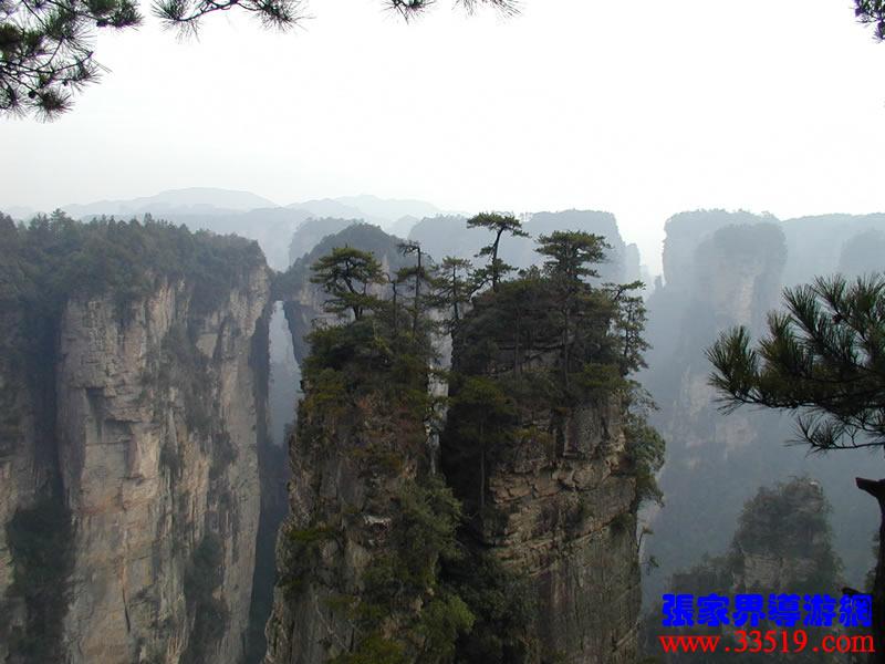 (天下第一橋)更多天下第一橋圖片>>>> 那就是“天下第一橋”。你們看,兩座山峰被一條長廊連在一起,形成天然橋洞,平時(shí)吞云吐霧,氣勢壯觀雄奇。橋面寬約兩米,長20余米,絕對(duì)高度357米。橋上蒼松挺拔,橋邊古藤垂掛,橋下深不可測。走在橋上,只見霧氣蒸騰,松濤呼嘯,石橋好像也顫顫悠悠,晃晃搖搖似的,令人驚心動(dòng)魄。這里是張家界風(fēng)景一絕,是大自然的一個(gè)奇跡。