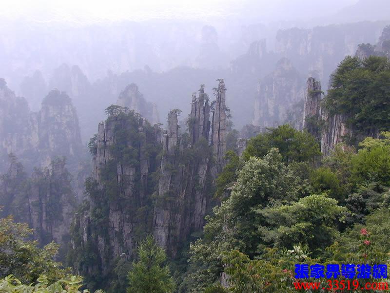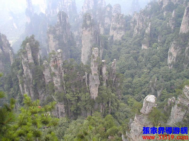 (大觀臺(tái))這就是大觀臺(tái)。極目遠(yuǎn)眺,千百座奇峰盡收眼底。一位詩人說,武陵源的砂巖峰林是一步一觀景,千步千造型,一山有四季,十步不同天。專家測算出武陵源石峰有3103座。一如一位高超的雕塑大師,模擬宇宙萬物,無不形狀逼真,維妙維肖,栩栩如生,呼之欲動(dòng)。有的如海螺出水,有的如金龜銜日,有的如蓮花盛開,有的如天橋橫空,有的如長槍刺天,有的如寶塔聳立,有的如老人采藥,有的如玉女梳妝,有的如將軍出征,有的如戰(zhàn)馬長嘯,有的如情人幽會(huì),有的如夫妻相擁,有的如仙女散花,有的如村姑守望有的孤峰獨(dú)秀,有的直插云霄,有的婷婷玉立,有的威武勇猛,有的小巧玲瓏,有的大氣磅礴。進(jìn)入武陵源,但見一片峰的森林,峰的世界,峰的海洋。挺拔、奇秀、集中、原始、粗獷、古野。這就是武陵源。一位藝術(shù)大師說:武陵源的山峰,改寫了山的概念。大攝影家陳勃說:“三山五岳堪比美,華夏風(fēng)光每一流。”王繼杰先生說:“武陵源上三日游,勝讀千篇李杜詩。”許世杰先生說:“秀幽險(xiǎn)峻稱奇絕,五岳黃山拜下風(fēng)。”李成瑞先生為此大抱不平:“神州勝景誰為最?須請(qǐng)霞公重評(píng)勘。”可惜徐霞客無緣到大觀臺(tái)來,也不可能為武陵源作甚評(píng)價(jià)了。