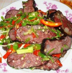 介紹: 血豆腐,就是將豆腐和豬血、豬肉及花椒、辣椒等佐料拌成泥狀,捋成卵形,以竹篩置火炕上,煙熏烤成臘黃,吃起來耐嚼味香,是土家特色菜,當地人常以其下酒。 在張家界的飯館里很難吃到正宗的土家特色菜,可以去做土味的特色餐館去解解饞。但是最正宗還是鄉(xiāng)下人家家里自己熏的,那才叫一個好吃?。?!