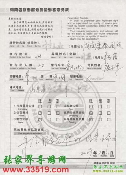 2009年7月11日山東曾先生一行52人質(zhì)量接待反饋單: