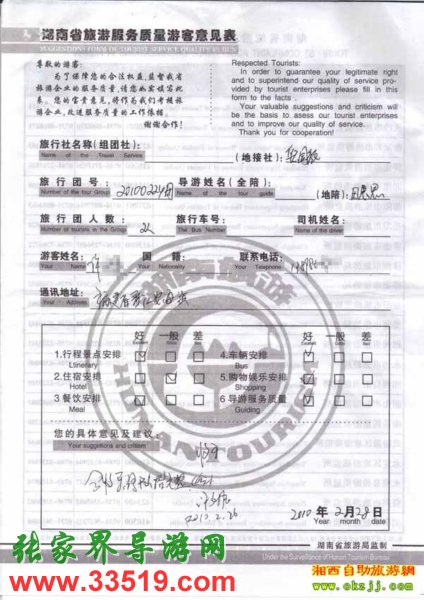 2010年2月28日許小姐一行2位旅游質(zhì)量反饋