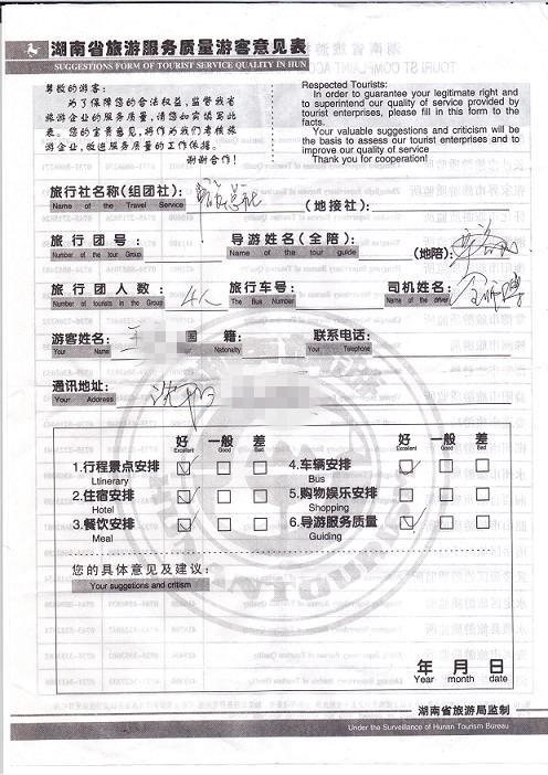 2011年3月27號王先生一行4人旅游質(zhì)量意見反饋