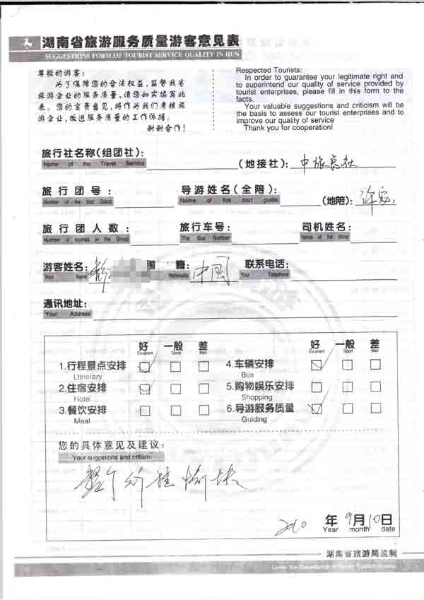 2010年9月10號婁底彭小姐一行4位旅游質(zhì)量反饋:整個行程愉快