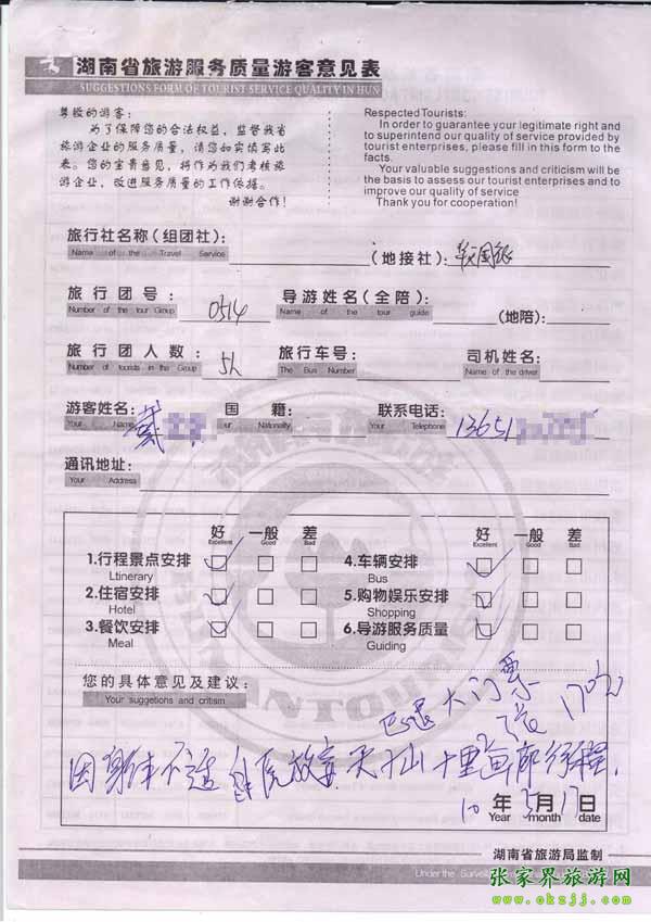 2010年5月17日戴先生一行5位旅游質(zhì)量反饋